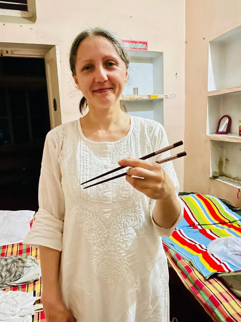 Valamikor délután Kazue felhívott, hogy megérkezett és a recepción van. Ő most érkezett Japánból, egy év után ismét Uttarkashiba indult, és most végre megengedték neki, hogy megszálljon pár napra a Sivánandásramban. Ez volt az egyetlen lehetőségünk találkozni, amikor eldöntöttem, hogy az utolsó két hetet Rishikeshben fogom tölteni. Nagyon örült nekem, hiszen kapcsolatban maradtunk egész évben, miután decemberben elbúcsúztunk egymástól. Annyira aranyos volt, hogy hozott nekem ajándékokat Japánból, többek között isteni finom kekszes csokit és egy igazi japán evőpálcikát, sőt, meg is tanította helyesen fogni 🙂